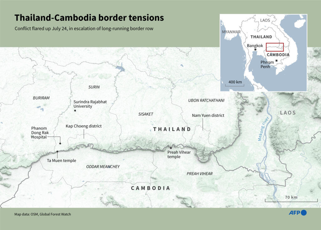 Oddar Meanchey (Cambodia) (AFP) – In the leafy grounds of a Buddhist pagoda, hundreds of Cambodians fleeing deadly clashes with Thailand take refuge in the open air, most sitting on the ground while a lucky few doze in hammocks.
