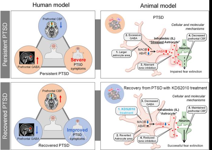 Astrocyte-Derived GABA and Therapeutic Effects of KDS2010 in PTSD. Brain imaging of PTSD patients revealed unusually high levels of GABA and reduced cerebral blood flow in the prefrontal cortex, showing that changes strongly correlated with symptom severity. In animal models, this excess GABA was traced to reactive astrocytes producing it abnormally due to increased MAOB and reduced levels of the GABA-degrading enzyme ABAT. This disrupted normal brain function and impaired the ability to extinguish fear. Treatment with KDS2010, a selective MAOB inhibitor, successfully lowered astrocytic GABA, restored brain activity, and rescued fear extinction, highlighting its potential as a therapeutic option.