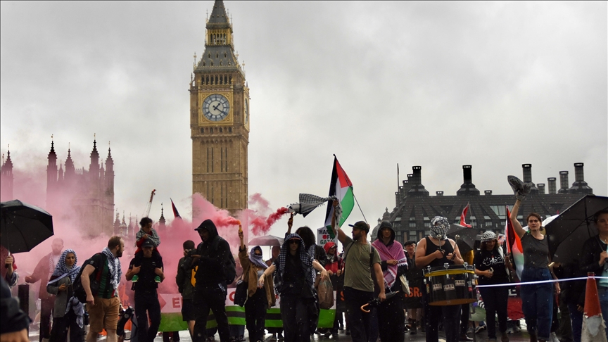 Pro-Palestinian demonstrators march past Big Ben as they march from Embankment Station during the 28th protest held since October 7, 2023, calling for an end to UK arms sales to Israel and condemning Israel’s attacks on Gaza as well as crackdowns on Palestinian solidarity in the UK on July 19, 2025 in London, United Kingdom.