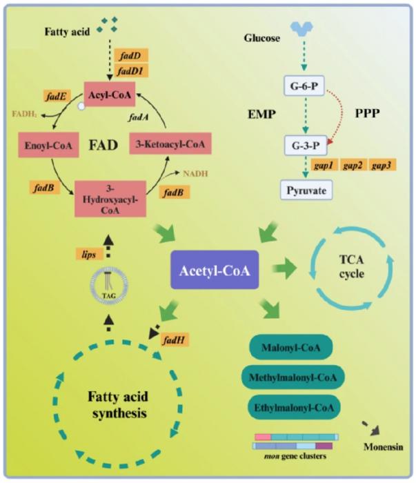Monensin is a vital antibiotic used in agriculture and medicine. By analyzing the genome of Streptomyces cinnamonensis, the team discovered that specific genes (fadD, fadE, fadB, fadA) in the fatty acid degradation pathway significantly boost monensin synthesis.