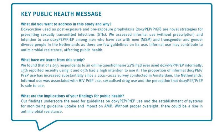 New research analysing an online survey of 1,633 respondents found 15% recent use of doxycycline post- and pre-exposure prophylaxis (doxyPEP/PrEP) among men who have sex with men (MSM), transgender and gender diverse people in the Netherlands according to a recent study published by Eurosurveillance [1]. These data highlight an increase in the informal use of doxyPEP/PrEP, with 65% of the participants intending to use it in the future. Currently, doxyPEP/PrEP is not recommended or actively promoted by healthcare professionals in the Netherlands. Informal use i.e. without a prescription by a healthcare professional, could contribute to antimicrobial resistance (AMR) and changes in the microbiome.