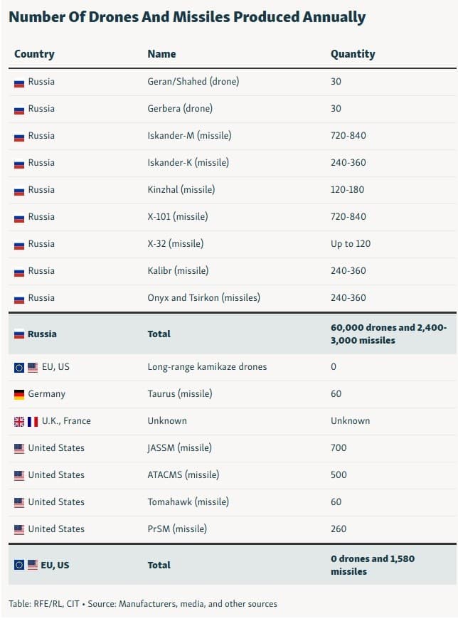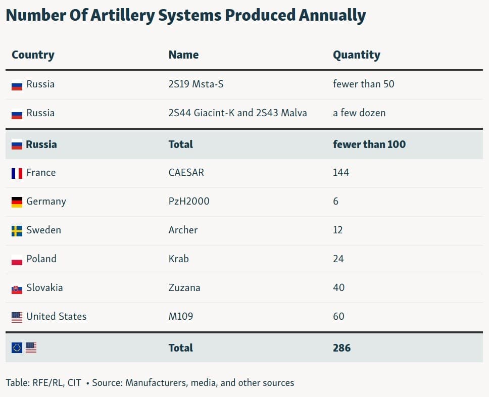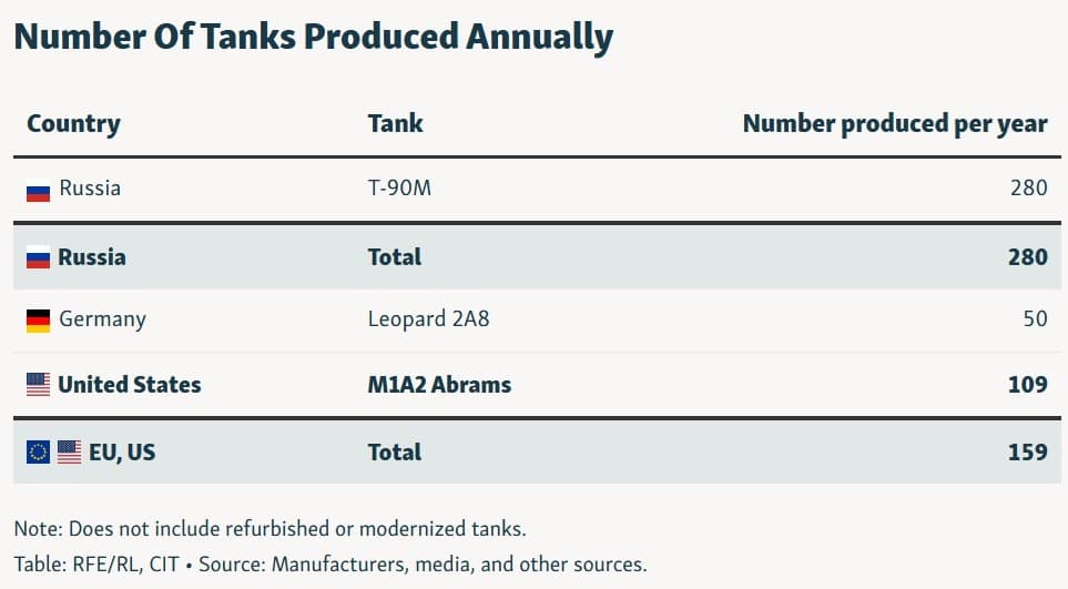 RFE/RL and the Conflict Intelligence Team (CIT), an open-source intelligence group, analyzed Russian and Western weapons production to assess whether Russia really has such a large production advantage over the US and its allies and in which categories of weapons -- artillery, ammunition, tanks, aircraft, missiles, and drones, and air defense -- each side has the upper hand.