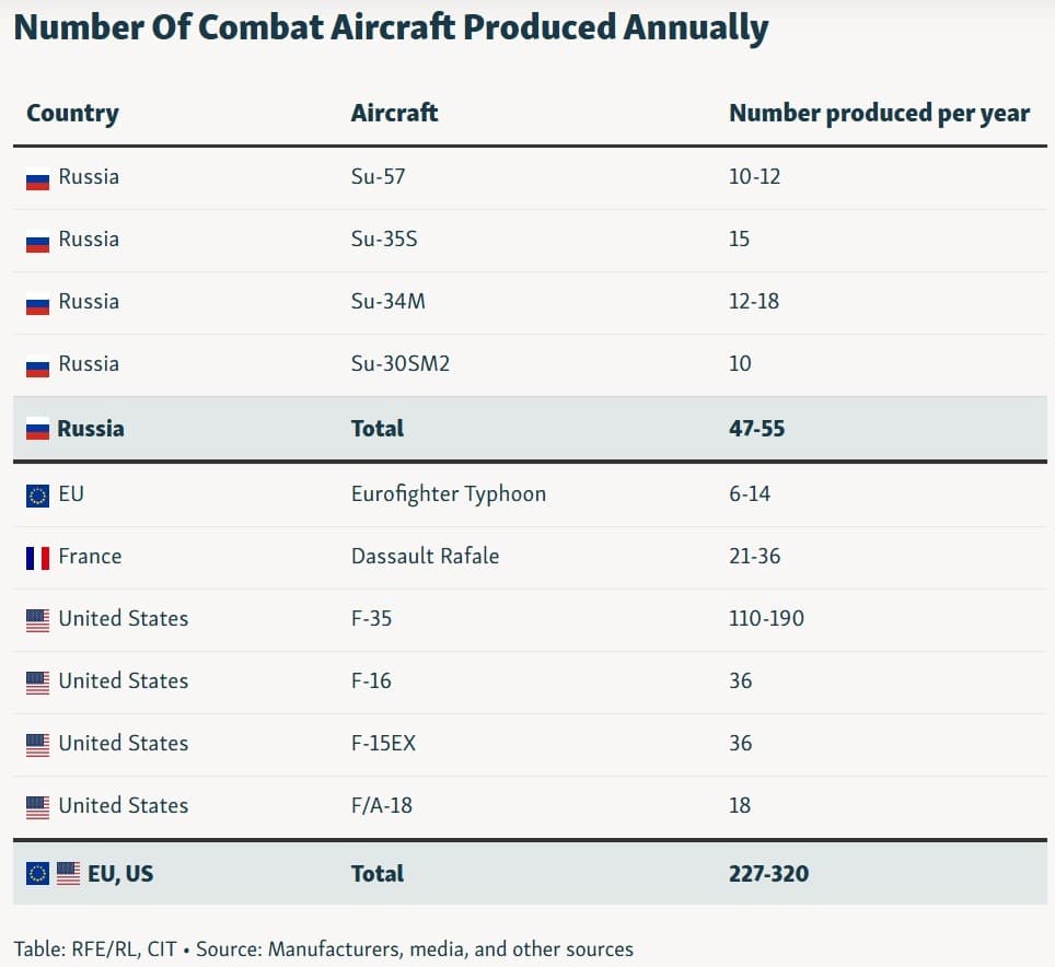 NATO production, though, is much higher, with US manufacturer Lockheed Martin on track to deliver over 170 F-35 strike fighters this year in addition to France, Sweden, and other EU countries making dozens of Rafale, Eurofighter Typhoon, and Gripen jets.