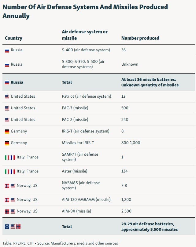 Raytheon builds some 12 Patriot missile-defense systems per year, while Germany’s Diehl plans to make 8 IRIS-T systems in 2025 and some 800-1,000 missiles for the system per year. NATO also produces the Norwegian-American NASAMS system, which can use AIM-120 AMRAAM or AIM-9X missiles. The US produces 1,200 and 2,500 of each missile per year, respectively.