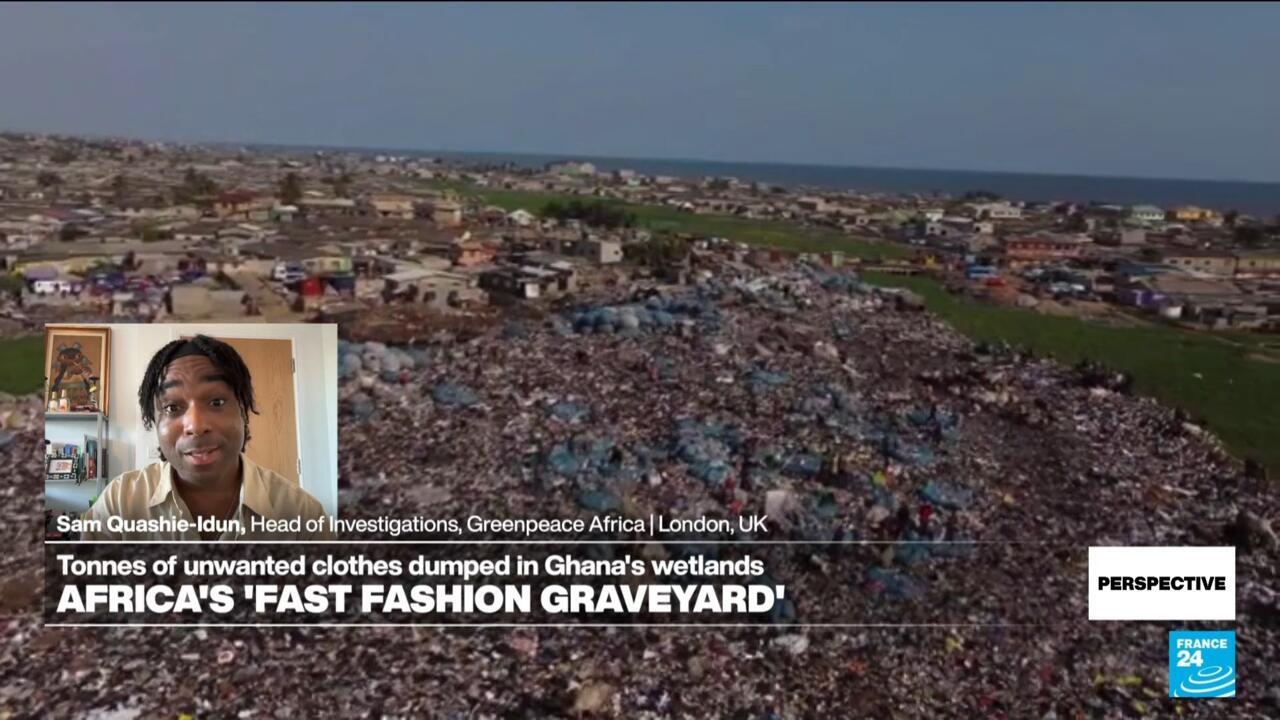 Ghana is already known as a "fast-fashion graveyard", but a new study has shown unwanted clothing is now being dumped beyond urban areas. Reporters at Unearthed, working with Greenpeace Africa, found mounds of clothes from brands including Next, Primark and H&M clogging areas of the protected Densu Delta. Sam Quashie-Idun, the head of investigations at Greenpeace Africa, told FRANCE 24's Perspective programme that one particular dumpsite now "looms taller than a two-storey building".