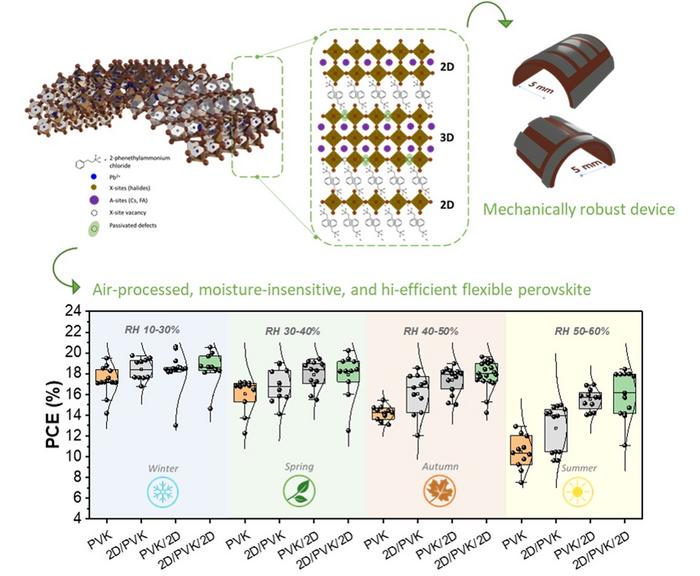 Conceptual diagram of material and process technology enabling the production of high-efficiency, high-durability flexible perovskite solar cells in various humidity conditions across all four seasons