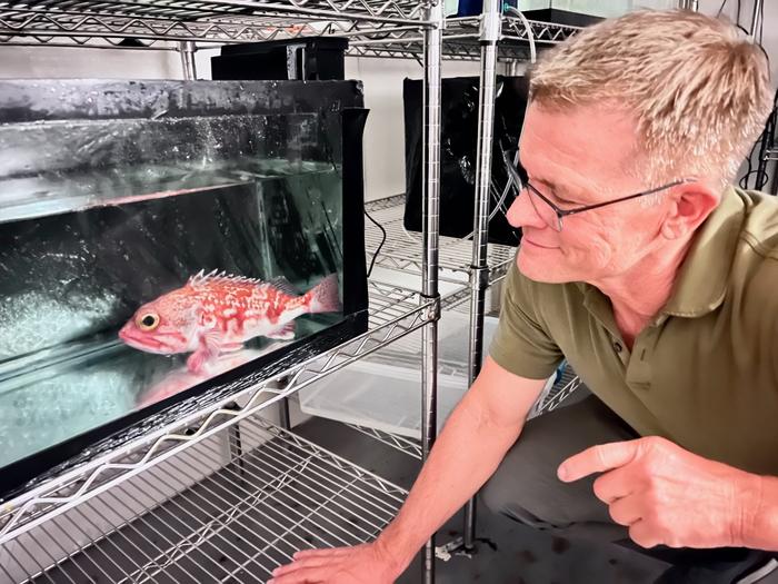 Martin Grosell, Ph.D., observes the blackbelly rosefish, the subject of the study.