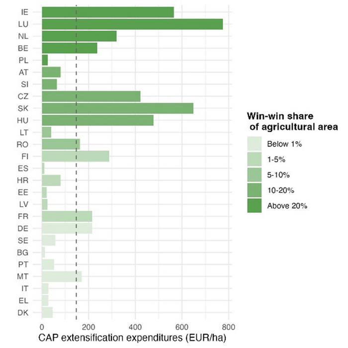 Caption: Win-Win Areas across EU-27 countries (a) Share of agricultural areas in which de-intensification of farming practices can deliver biodiversity and climate benefits with minimal cost. (b) Aligning CAP support with win-win areas could achieve greater biodiversity gains and carbon sequestration. The dashed line is the EU average planned CAP support for de-intensification measures. Countries are ranked by their share of win-win areas. Values reflect total planned annual budgets for extensification measures divided by utilized agricultural area. The figures represent comparable but simplified averages.