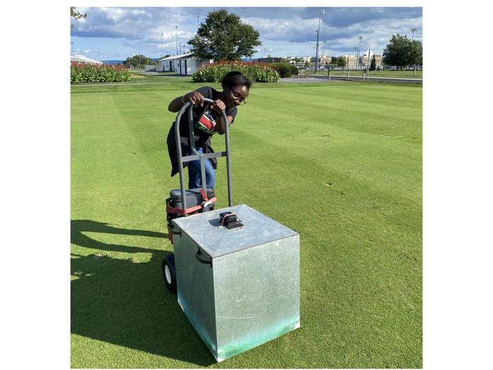 Study first author Maureen Kahiu, who earned her master’s degree from Penn State with this research project, maneuvers a light box on a research fairway, used to take closeup photos of turfgrass damage resulting from fungicides that golf course managers use to suppress diseases such as dollar spot.