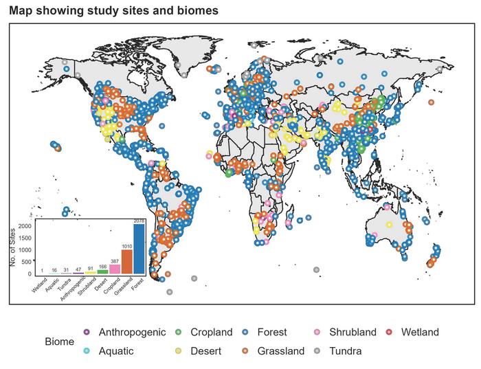 Global distribution of 3,500+ study sites used in the analysis of AM fungal spore traits across diverse biomes. Map by Smriti Pehim Limbu.