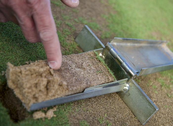 Mike Richardson, professor of horticulture with the Arkansas Agricultural Experiment Station, points out the root zone of turfgrass in a wetting-agent study.