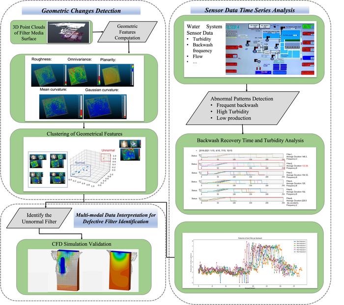 The multi-dimensional data interpretation framework integrates upside-down 3D laser scanning, SCADA sensor data analysis, and CFD simulation validation, tested on actual water treatment filters during backwash operations. The framework features non-invasive detection through geometric feature analysis and time-series pattern recognition, achieving reliable identification of subsurface structural defects. This system could be applied in smart water treatment facilities for automated filter health monitoring, predictive maintenance, and optimized backwash operations.