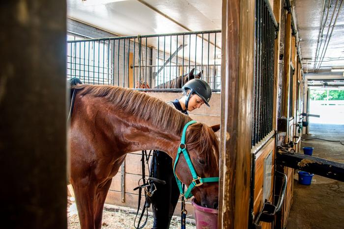 A student works with a horse in the UConn stables.