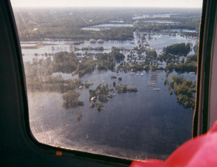View from a helicopter showing flooded area along the banks of the Tar River in the wake of Hurricane Floyd, Sept. 1999.