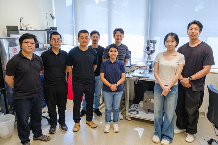(Left to right) NTU Research Fellow Dr Tran Ngoc Phuoc Thanh; Senior Research Fellow Dr Le Duc Long; Prof Hirotaka Sato; Research Engineers Jean Allen Academia and Mya Myet Thwe Chit; and Project Officers Greg Angelo Gonzales Nonato, Fan Zifu and Marcus Wong, with the automated cyborg insect factory prototype.