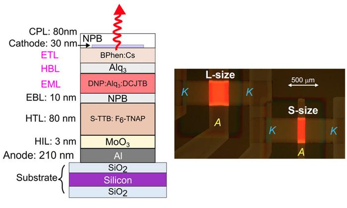 Researchers showed that OLEDs can be made faster by suitable material selection and device design to achieve record-fast transmission. A stable organic compound called dinaphthylperylene (DNP), known for its long operational lifetime and fast light emission, is one key. Top-emitting red OLEDs are pictured: (left) schematic, (right) microscope image.