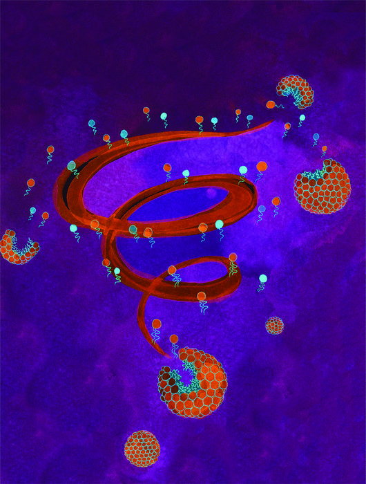 Artist rendering showing a vortex of energy and how certain lipids and fatty acids come together to form a membrane. The process is cyclical as components come together and separate and energt is added and removed.