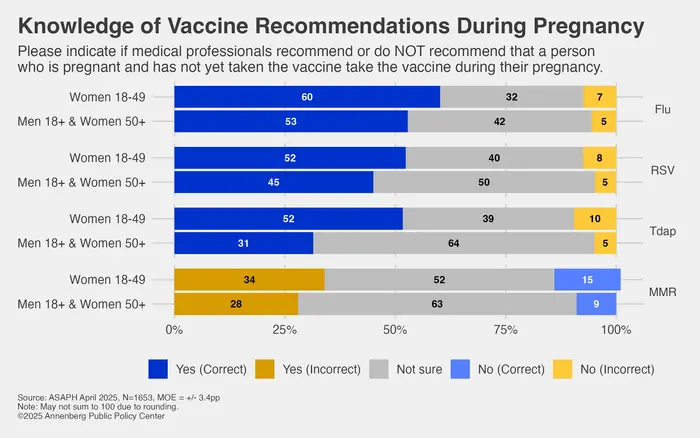 The survey finds a significant drop over the past year, since April 2024, in the numbers of people who know that medical professionals recommend these three vaccines for most pregnant people.