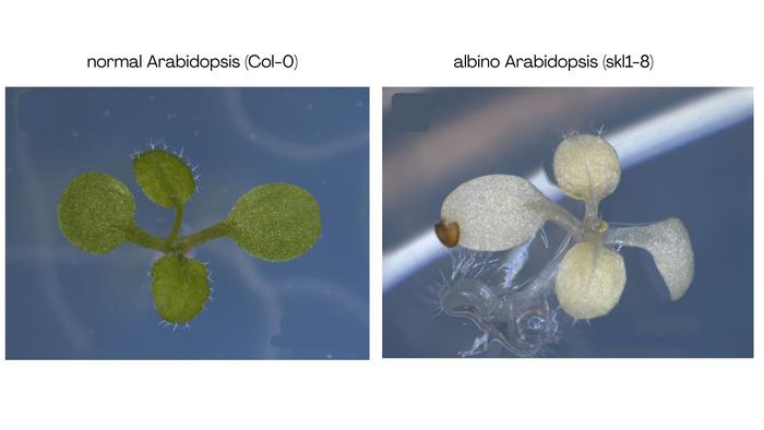 Picture of normal vs albino arabidopsis seedlings. The albino seedling skl1-8 is missing the activity of the SKL1 protein.