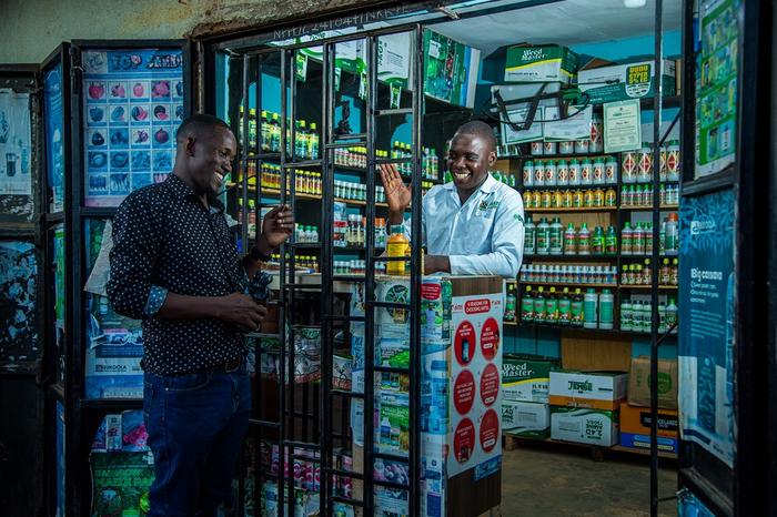 A young agro-dealer engages with a smallholder farmer in Uganda