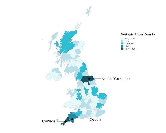 UK map showing where around 100 UK participants’ nostalgic places are. The map indicates that UK participants were particularly nostalgic about places in Cornwall and Devon which have some of the most popular coastlines in the country. North Yorkshire also performed well perhaps because, the researchers explain, it blends blue and green, boasting a long coastline and the Yorkshire Dales.
