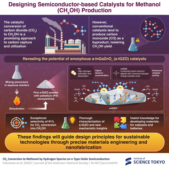 In a recent study, a research team led by Professor Hideo Hosono from the MDX Research Center for Element Strategy at Institute of Science Tokyo (Science Tokyo), Japan, presents a novel approach to overcome current limitations. Their findings, which were made available online on June 16, 2025 and published in Volume 147, Issue 26 of the Journal of the American Chemical Society on July 02, 2025, reveal how n-type oxide semiconductors can be engineered into highly efficient catalysts for CO2-to-CH3OH conversion. This work was co-authored by Professor Masaaki Kitano, and Assistant Professor Masatake Tsuji, also from Science Tokyo, and conducted in collaboration with Mitsubishi Chemical Corporation.