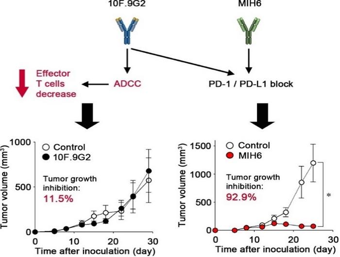 10F.9G2, a monoclonal antibody with high antibody-dependent cellular cytotoxicity, has an off-target effect that involves the reduction of CD8+ T cells. This surpasses the on-target effect, namely programmed cell death protein 1/programmed death-ligand 1 axis inhibition, resulting in no observable antitumor efficacy. In contrast, MIH6, which has low antibody-dependent cellular cytotoxicity activity, exerts only the on-target effect, leading to an effective antitumor response.