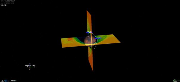 Caption: A simulation of the M-MATISSE spacecraft, Henri and Marguerite, exploring the plasma environment around Mars.