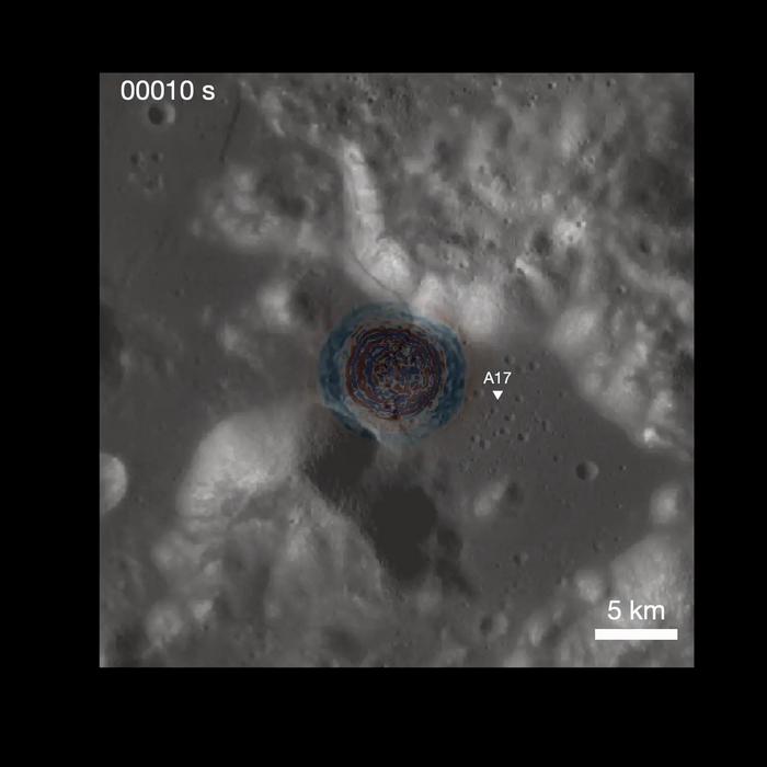 A computer simulation depicting the seismic waves emanating from a shallow moonquake occurring on the Lee-Lincoln scarp in the Taurus-Littrow Valley on the Moon and interacting with the Apollo 17 Lunar Module landing site. The audio is the corresponding vertical ground motion from the simulation. Both audio and video are sped up by a factor of 10. The background image is a globe mosaic image from the Lunar Reconnaissance Orbiter Camera Wide Angle Camera (LROC-WAC). Red and blue are positive (upward ground motion) and negative (downward ground motion) polarities of the wave.