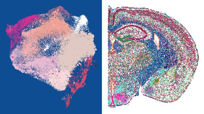 On the left: single-cell analysis of bone marrow samples from patients with myelodysplastic syndromes. On the right: spatial analysis of a murine brain section. In both cases, each point represents a cell, colored according to the cell type identified by Cell Marker Accordion.