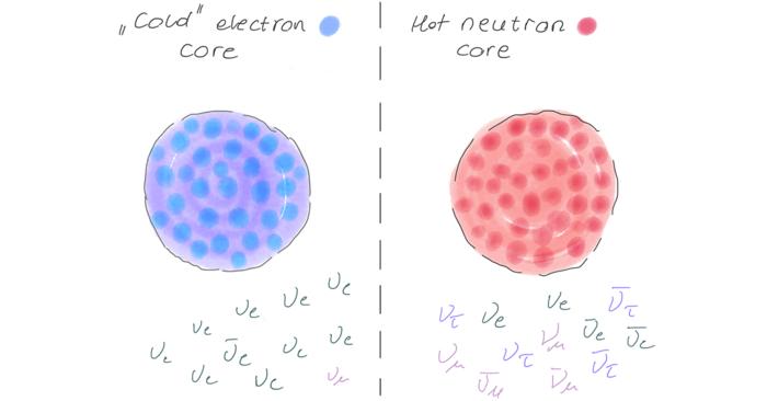 Eventually the collapsing star’s density becomes so high that the neutrinos are trapped and collide with each other. With purely standard model interactions, the neutrinos will be mostly electron flavor, the matter will be relatively “cold,” and the collapse will likely leave a neutron star remnant. However, secret interactions that change neutrino flavor radically alter this scenario, producing neutrinos of all flavors and leading to a mostly neutron “hot” core that may lead to a black hole remnant.