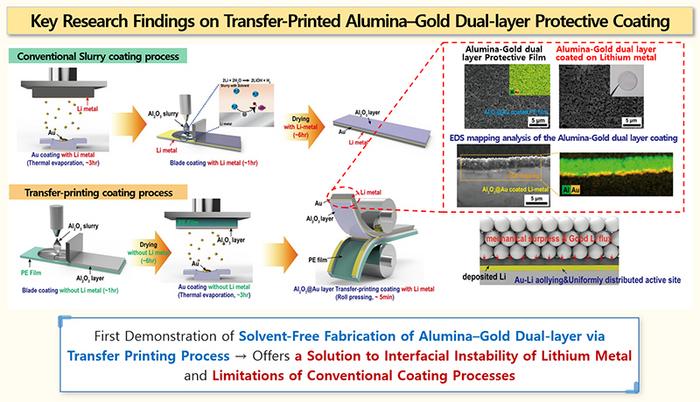 Solvent-free transfer printing enables uniform alumina–gold dual-layer coatings on lithium metal, overcoming interfacial and process limitations of conventional methods.