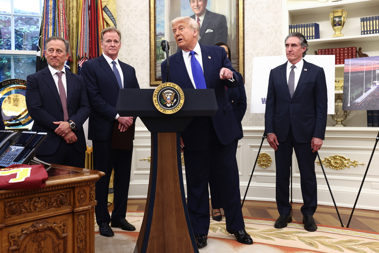 US President Donald Trump (center right), alongside Washington Commanders owner Josh Harris (left), National Football League Commissioner Roger Goodell (center left), and Secretary of the Interior Doug Burgum, announces that Washington will host the 2027 NFL draft in the Oval Office of the White House, in Washington, May 5. EPA-Yonhap