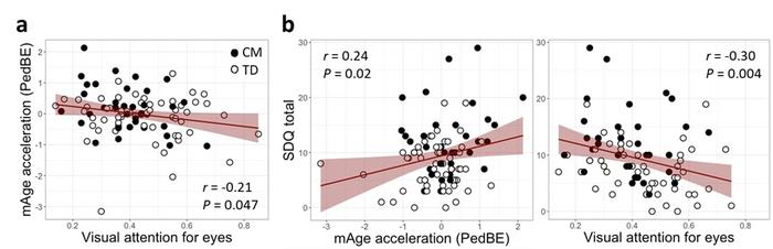 The plots shown above depict a marked link between a child’s biological age, as determined through DNA methylation age (mAge), and their visual attention for eyes. These factors are also linked to higher scores in the Strength and Difficulties Questionnaire (SDQ) – an indicator of accelerated aging and decreased eye contact as a result of childhood maltreatment.