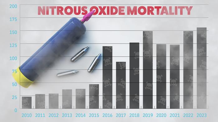 Hoopsick and Yockey studied 14 years of CDC WONDER data and found that nitrous oxide-related deaths were relatively low in 2010 with 23 deaths, but climbed to 156 in 2023, a 578% relative increase over time.