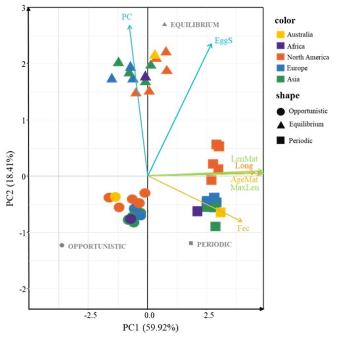 Mean principal component scores of fishes from 14 river basins, derived from their seven life history traits.