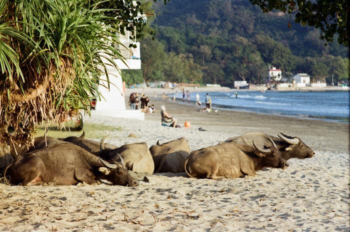 Buffalo bronze themselves alongside human bathers on a south Lantau beach in Hong Kong.