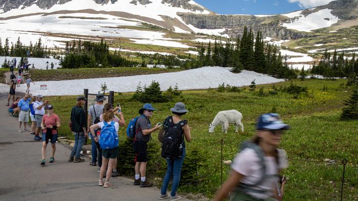 A mountain goat grazes near a trail full of visitors at Glacier National Park in Monana