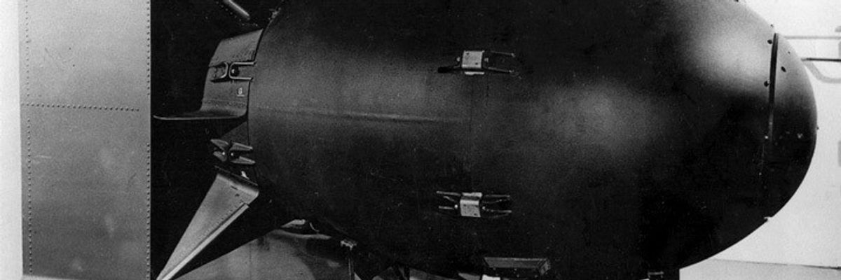 A copy is shown of the "Fat Man" bomb that was dropped on Nagasaki on August 9, 1945.