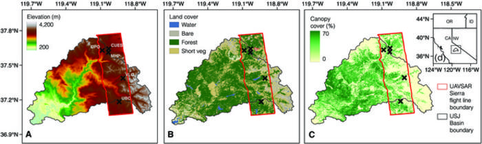 (A) Elevation, (B) land cover, and (C) canopy cover (%) for the Uninhabited Aerial Vehicle Synthetic Aperture Radar (UAVSAR) flight line (red outline) and the Upper San Joaquin River basin (USJ; black outline). (D) shows the location of the study area within California. The black crosses represent the 5 snow pillow locations. DPO, Devils Postpile; CUES, Cold Regions Research and Engineering Laboratory of the US Army Corps of Engineers and University of California, Santa Barbara Energy Site on Mammoth Mountain; MHP, Mammoth Pass; VLC, Volcanic Knob; UBC, Upper Burnt Corral.