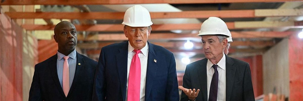 U.S. President Donald Trump walks with Federal Reserve Chair Jerome Powell (R) and US Sen. Tim Scott (L), Republican of South Carolina, as he visits the Federal Reserve in Washington, D.C., on July 24, 2025.