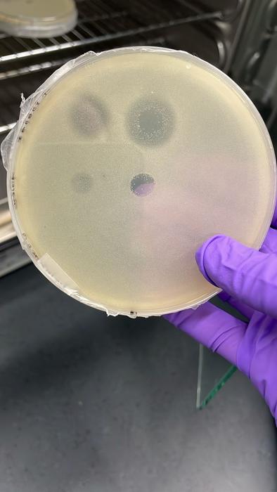 The salt-loving Halalkalibacterium halodurans, growing on a petri dish in the Warnecke lab, is killed by proteins secreted by the archaeon Halogranum salarium.
