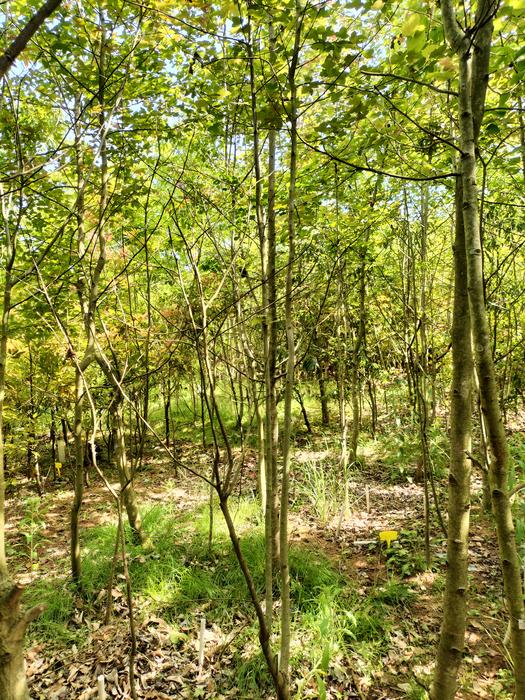 This photo shows inside an experimental site in Putuo, China. Individual trees of one species (Triadica sebifera) are surrounded by neighboring trees of another species (Liquidambar formosana).