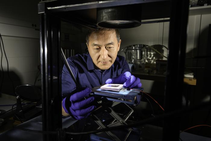 Rochester researcher Chunlei Guo tests a solar thermoelectric generator (STEG) etched with femtosecond laser pulses to boost solar energy absorption and efficiency. His lab’s innovative black metal technology design helps create a STEG device 15 times more efficient than previous devices, paving the way for new renewable energy technologies.
