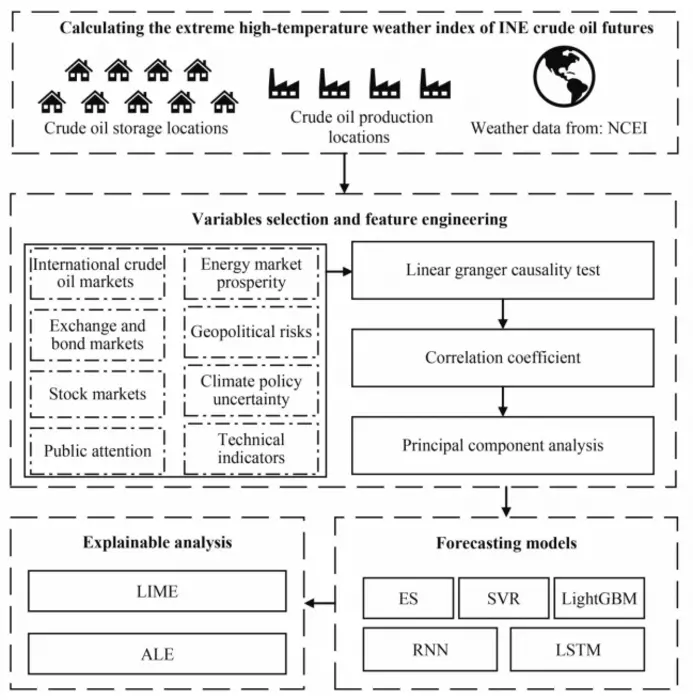 Considering the aforementioned limitations, this research makes three significant contributions to the current literature. First, we develop an extremely high-temperature weather index (HTI) based on daily meteorological data specific to the crude oil production and storage sites of the China International Energy Exchange (INE). Unlike previous indices that broadly describe the frequency of extreme weather events on a global or national scale (Guo et al., 2023a) or those derived from textual reports on extreme weather attention (Xu et al., 2023), our HTI provides a finer scale to present extreme high-temperature weather information for INE crude oil price prediction.