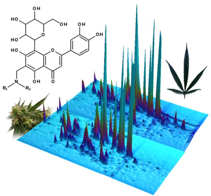 Two-dimensional liquid chromatographic separation of phenolics from Cannabis leaf and bud material, with each peak indicating a distinct compound present in the sample. An example structure of the newly discovered flavoalkaloids is shown on the top left.