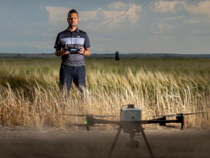 Montana State University assistant professor Anish Sapkota has earned a 2025 Emerging Science Award from the Western Society of Crop Science. Sapkota works with drones and remote sensing among other areas of precision agriculture. MSU photo by Marcus "Doc" Cravens