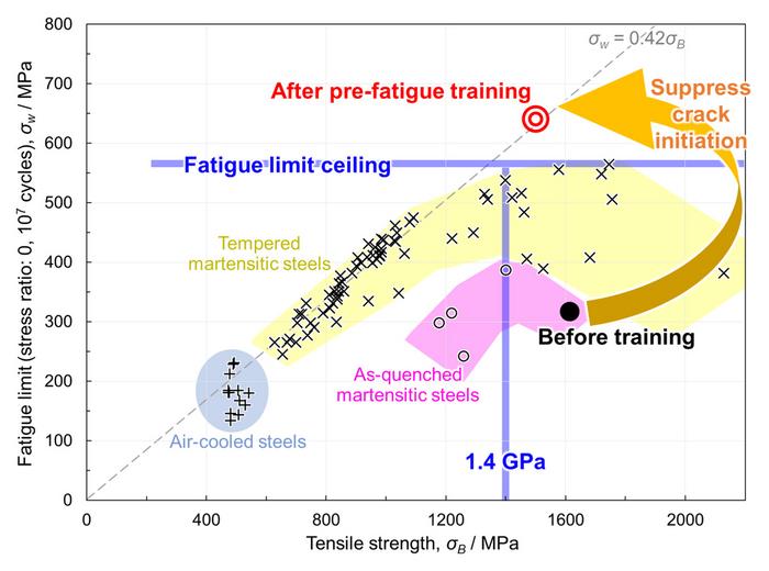 Fatigue limit—the stress level below which a material can endure for an infinite or sufficiently large number of loading cycles without failure— increases proportionally with tensile strength in steels. However, when the tensile strength exceeds 1.4 GPa (gigapascals), further increases in the tensile strength do not improve or rather decrease the fatigue limit, that is, the “fatigue limit ceiling”. In addition, martensitic steel, a representative high-strength steel, generally exhibits a low fatigue limit in the as-quenched state with the highest strength level. As a result, before practical applications, martensitic steels are typically tempered to improve fatigue performance, sacrificing the strength level. The detailed mechanism behind the fatigue limit ceiling remains unclear, and there has been a strong demand for materials design strategies to overcome the ceiling.