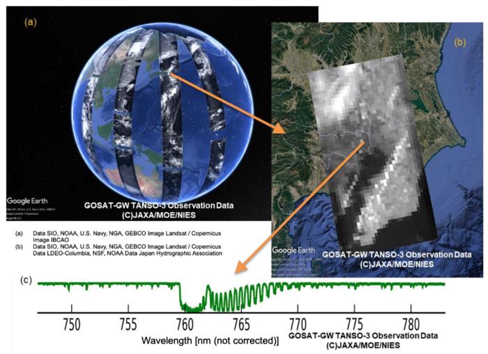 Note: In Figures 1, 2, 3, and 5, the areas observed by TANSO-3 are shown in grayscale images. Other areas are shown in color Google Earth images.