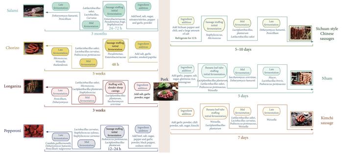 This image compares the microbial dynamics and production stages in traditional fermented sausages, highlighting differences between Western sausages (such as salami, chorizo, longaniza, and pepperoni) and Eastern sausages (such as Sichuan sausage, Nham, and kimchi sausage). It illustrates the microbial communities involved at various stages of fermentation and their influence on the development of characteristic flavors.